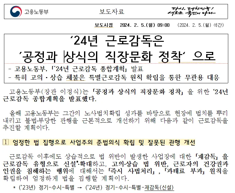 [출처: 2.5 고용노동부 2024년 근로감독 종합계획 발표(근로감독기획과)]