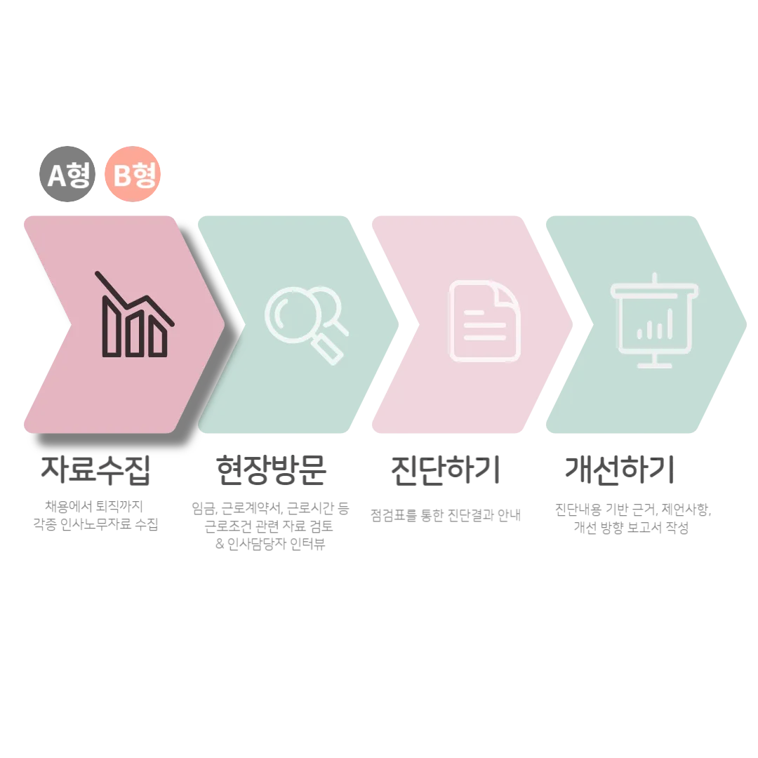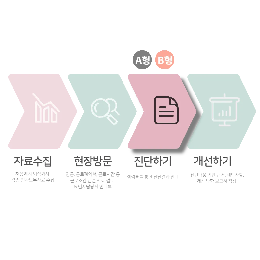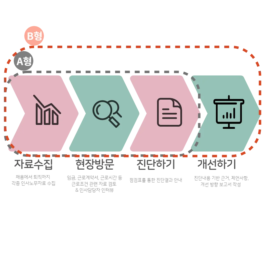 필요에 따라 우리조직 상황 점검을 위한 진단[A형]을 받을 수 있고, 우리조직 상황 점검을 위한 진단과 함께 개선을 위한 개선의견서를 제공[B형]받는 것으로 자유롭게 선택이 가능합니다.