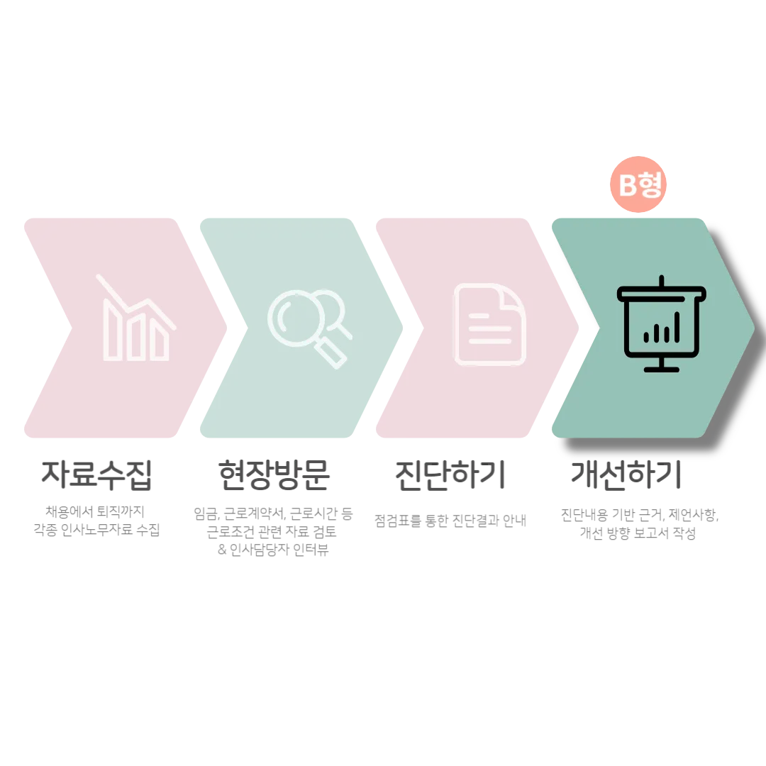 [A형]과 [B형]의 가장 큰 차이점은 “개선하기”입니다. [A형]이 현 상황을 점검하고 진단하는 컨설팅이라면, [B형]은 보고서 형태의 산출물을 추가로 제공합니다. 보고서는 진단의 근거와 개선이 필요한 부분과 해결 방안 등을 담고 있어 사업장에서는 보고서를 가이드라인 삼아 개선할 수 있도록 하는 서비스를 제공합니다.