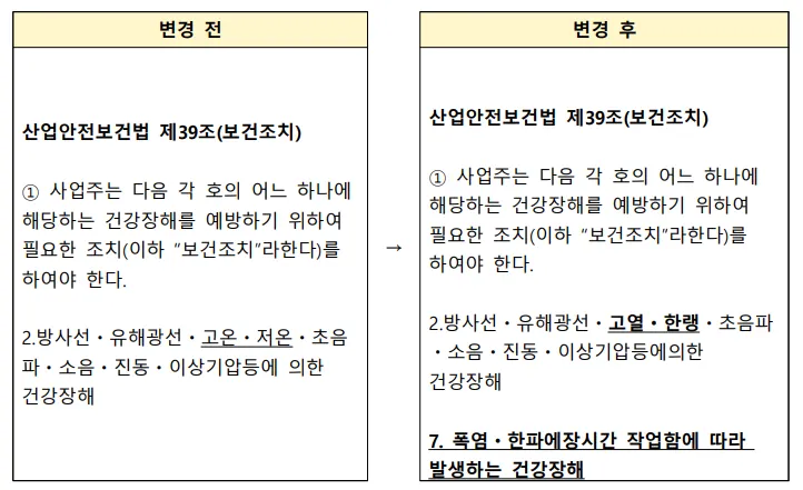 산업안전보건법 개정을 통해 폭염과 한파를 근로자의 건강을 위협하는 요인으로 명확히 규정하였으며, 사업주에게 근로자가 폭염ㆍ한파에 장시간 작업함으로써 발생하는 건강장해를 예방하기 위한 조치를 의무화하였습니다.