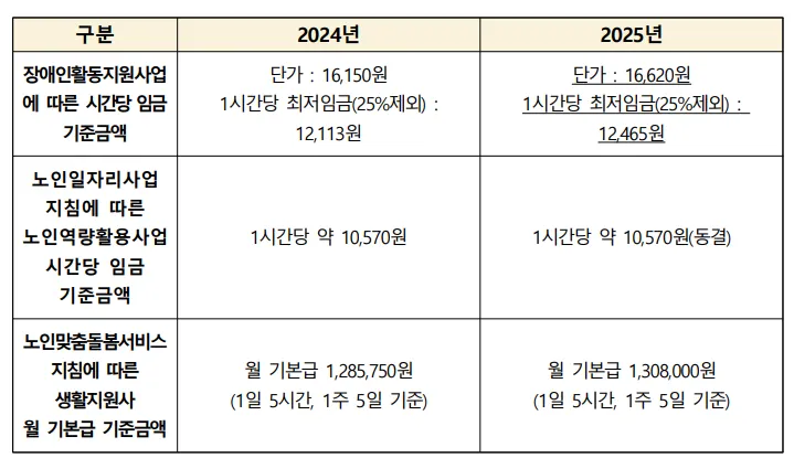 사업별 최저임금은 위 표와 같으며, 구체적인 근로 조건 및 세부 사항은 각 사업별 사업안내 지침을 참고해 주시기 바랍니다.