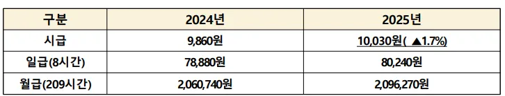 2025년 1월 1일부터 시간당 최저임금은 10,030원으로 인상됩니다. 2024년 최저임금인 9,860원보다 170원(1.7%) 인상된 금액입니다.