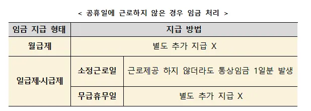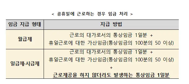 공휴일에 근로하는 경우라도 임금 지급 형태에 따라 다음 표와 같이 임금 처리 방법이 달라집니다.