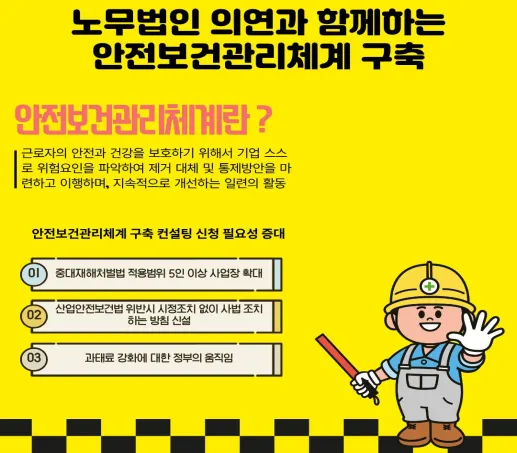 최근 산업 현장에 대한 근로감독이 대폭 강화되면서, 각 사업장에는 보다 전문적이고 체계적인 정비가 요구되고 있습니다. 각 사업장의 여건과 업무 특성에 부합하는 맞춤형 관리체계 구축이 필요합니다. 그러나 사업장 내부의 노력만으로 모든 법적 요구와 관리체계를 충족하기에는 한계가 있는 것이 사실입니다.