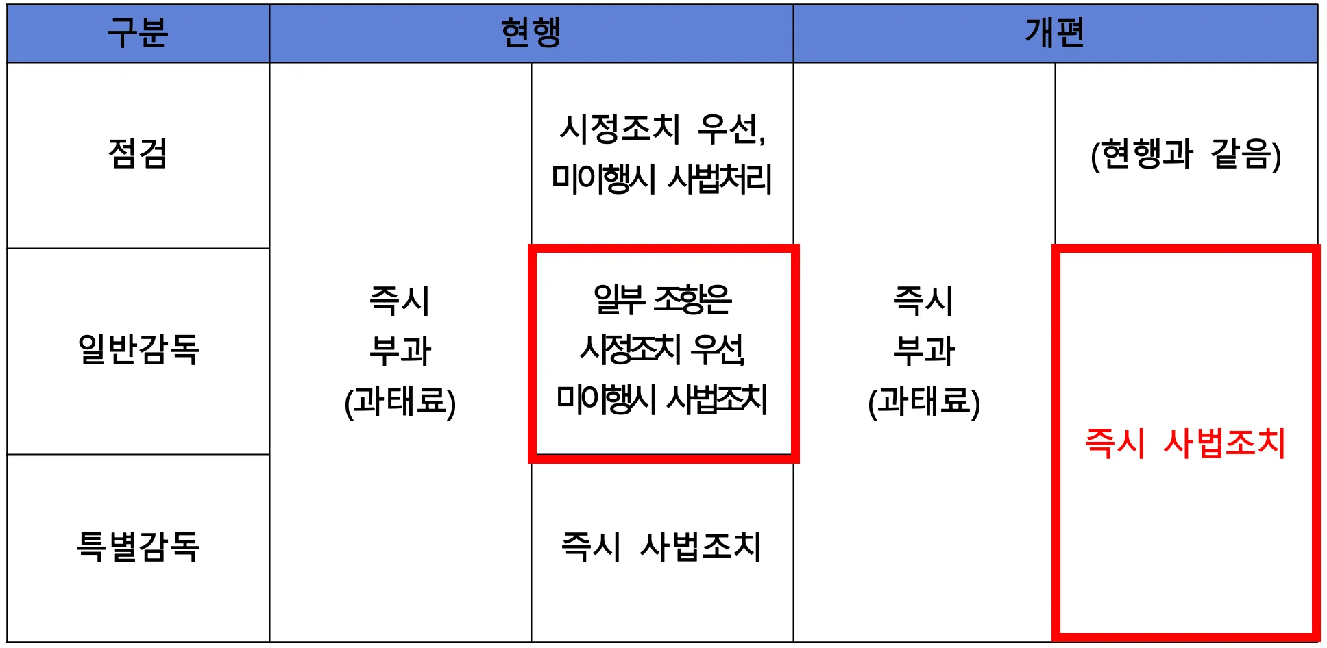 그러나, 2025년 10월 1일부터 일반감독도 특별감독과 동일하게 '모든 위반 사항'에 대해 시정기회 없이 즉시 사법조치로 전환될 예정입니다.